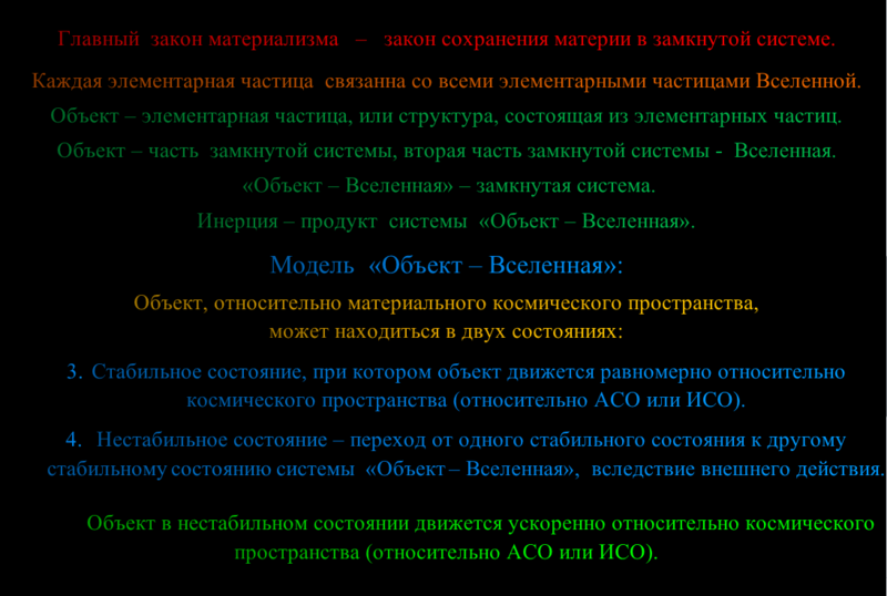 Движение материи АБСОЛЮТНО, движении вообще способ существования материи, относительна лишь скорость ПОСТУПАТЕЛЬНОГО движения, а вращение и тепловое движение абсолютны, чтоб ты знал, и не писал больше подобных глупостей.Никак.За нос водишь ты себя сам, Ньютон к этому не причастен.Только замкнутые материальные системы и никаких АСО/ИСО. Все законы корректно применимы только в отсутствии неконтролируемых внешних воздействий, т.е. в ЗАМКНУТЫХ системах.Опыт ММ ОДНОЗНАЧНО показал увлечение эфира движением вещества. А интерпретаторы оказались неспособны этого понять.Поскольку никаких ИСО нет в природе, поскольку ИСО не материальная, а чисто математическая конструкция, то никакие физические явления от ИСО не зависят, и им не место в физике - науке о законах движения материи.